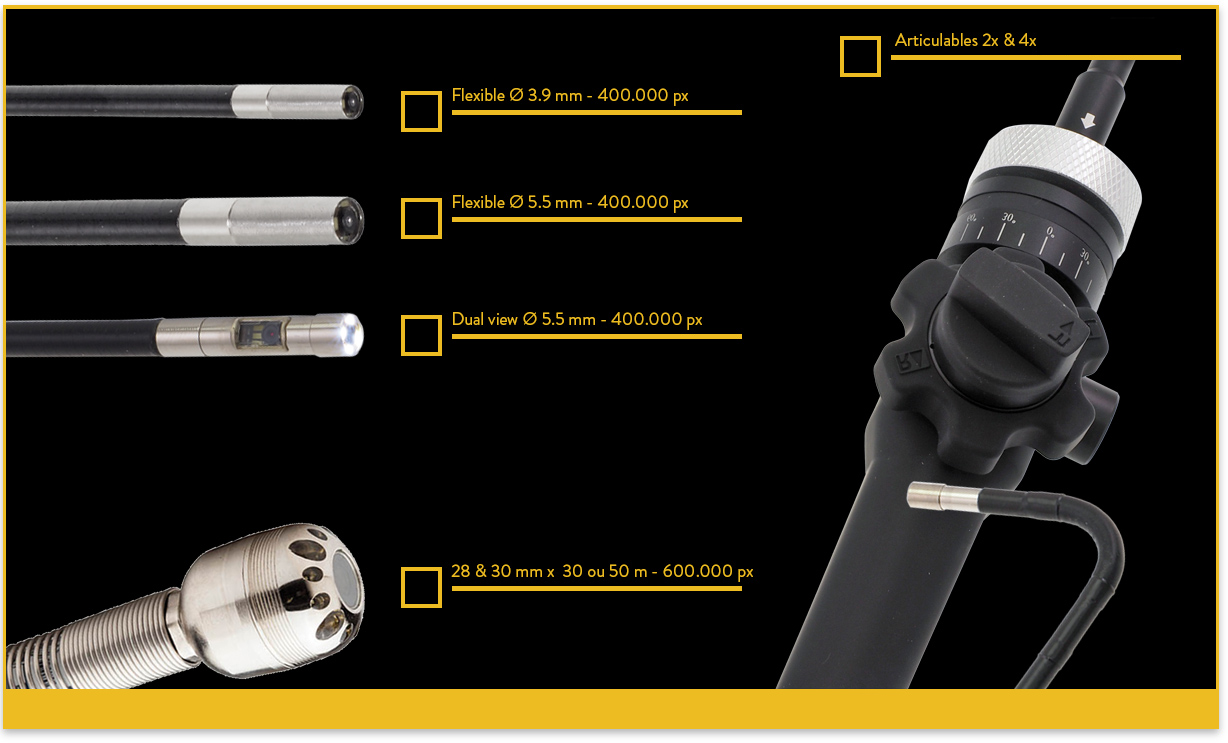 Un nombre important de sondes vidéo haute résolution et d’accessoires dédiés en font un instrument de contrôle polyvalent en atelier, sur site dans un très grand nombre de secteurs. Se référer à notre documentation pour la liste complète des sondes disponibles.
