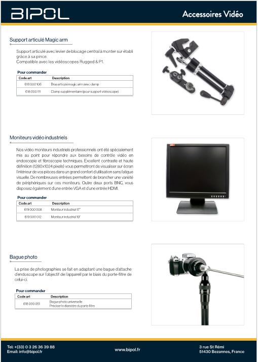 Notre moniteur vidéo industriel professionnel (17″ ou 19″) a été spécialement mis au point pour répondre aux besoins de contrôle vidéo en endoscopie et fibroscopie techniques. Son excellent contraste et haute définition (1024×768 pixels) vous permettront de visualiser sur écran l’intérieur de vos pièces dans un grand confort d’utilisation sans fatigue visuelle. De nombreuses entrées permettent de brancher une variété de périphériques sur ce moniteur. Outre deux ports BNC, vous disposez également d’une entrée VGA et d’une entrée HDMI.