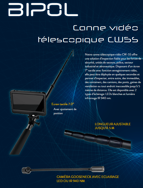 Notre canne télescopique vidéo CW-5S offre une solution d’inspection fiable pour les forces de sécurité, unités de secours, police, secteur industriel et aéronautique.