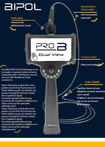 Unser neues Videoskop PRO B Dual bietet einen großen, hochauflösenden 6″-Touchscreen in Verbindung mit einer Doppel-Kamera-Videosonde, die es ermöglicht, sowohl axial (0°) als auch radial (90°) gleichzeitig zu sehen, dank der Bildschirmteilung.