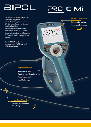 Das Videoskop PRO C ist ein kompaktes, tragbares Mikrovideoskop, das aus einer hochauflösenden CMOS-Mikrokamera besteht, die auf einer flexiblen, mit Wolfram ummantelten Sonde montiert ist. Bilder und Videos können einfach über eine Taste am Griff des Videoskops gespeichert werden. Das PROC bietet eine hervorragende Auflösung und eine LED-Beleuchtung.