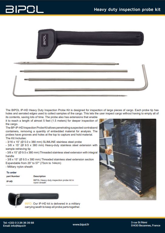 The BIPOL IP-HD1 Heavy Duty Inspection Probe Kit is designed for inspection of large pieces of cargo. Each probe tip has holes and serrated edges used to collect samples of the cargo. This lets the user inspect cargo without having to empty all of its contents, saving lots of time. The probe also has extensions that enable it to reach a length of almost 5 feet (1.5 meters) for deeper inspection of the
