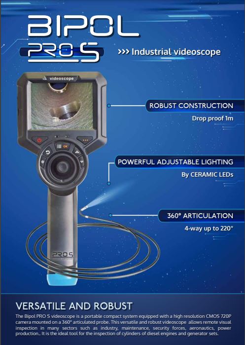 The Bipol PRO S videoscope is a portable compact system equipped with a high resolution CMOS 720P camera mounted on a 360° articulated probe with a bending radius up to 220°. Images and videos are displayed on a 3.5” high definition screen (1280x720P).