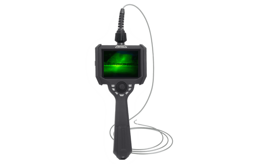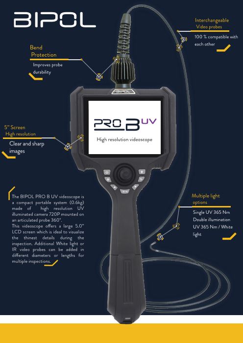 The PRO B UV (Ultraviolet) videoscope is a lightweight portable compact system featuring a high resolution 720P camera mounted on a 360° articulating probe. Images and videos are displayed on a large 5” high-definition screen.