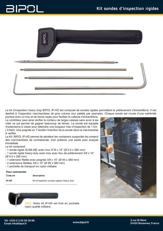 Le kit d’inspection heavy duty BIPOL IP-HD est composé de sondes rigides permettant le prélèvement d’échantillons. Le Kit BIPOL IP-HD permet de pénétrer les containers suspecté de contenir des marchandises de contrebande, d’en prélever une partie pour analyse immédiate. Il est destiné à l’inspection marchandises de gros volume (sur palette par exemple). Chaque sonde est munie d’une extrémité pointue avec un trou et des bords rayés pour faciliter la collecte d’échantillons. Le contrôleur peut ainsi vérifier le contenu de larges caisses sans avoir à les vider ce qui permet de gagner beaucoup de temps. La sonde est équipée d’extensions à visser pour atteindre une longueur max d’inspection de 1.5m. Une poignée en T facilite l’insertion de la sonde dans la marchandise à vérifier.